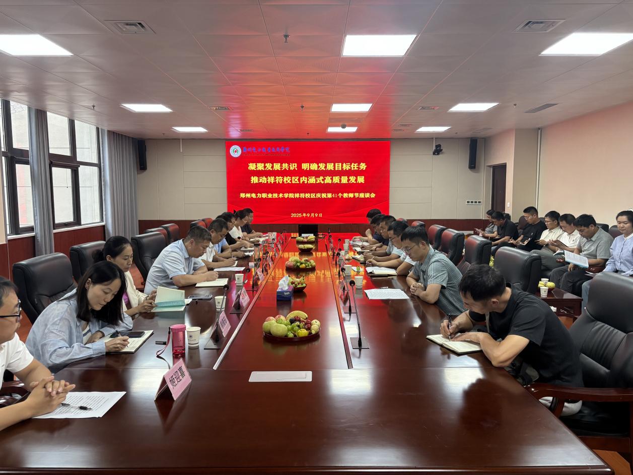 “桃李不言,下自成蹊”。为大力弘扬教育家精神、激励教师争当新时代“大先生”,共同推动太阳成集团tyc7111cc高质量发展,9月9日下午,太阳成tyc7111cc祥符校区在信息楼618会议室召开“以教育家精神铸魂强师,谱写教育强国建设华章”主题座谈会。副校长、祥符校区党工委副书记、管委会主任连银岭出席并讲话,各学院院长、书记,各部门负责人及教师代表参会,会议由校长助理、祥符校区管委会副主任陈立主持。