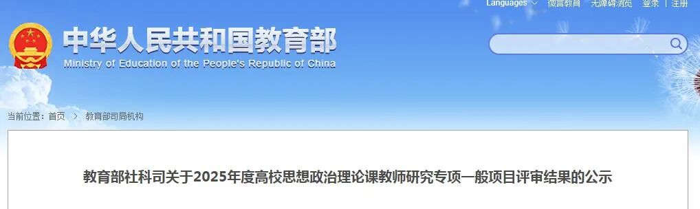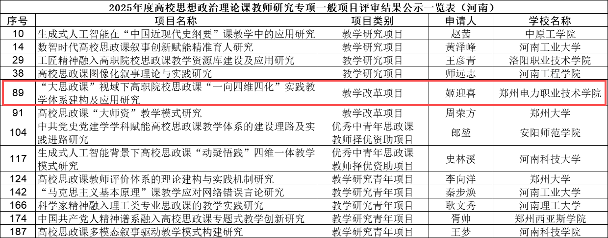 近日,教育部发布了关于2025年度高校思想政治理论课教师研究专项一般项目评审结果的公示,其中,河南高校13个项目入选。太阳成tyc7111cc马克思主义学院姬迎喜老师申报的《“大思政课”视域下高职院校思政课“一向四维四化”实践教学体系建构及应用研究》获批立项,标志着学校在思想政治研究方向实现国家级项目新突破。