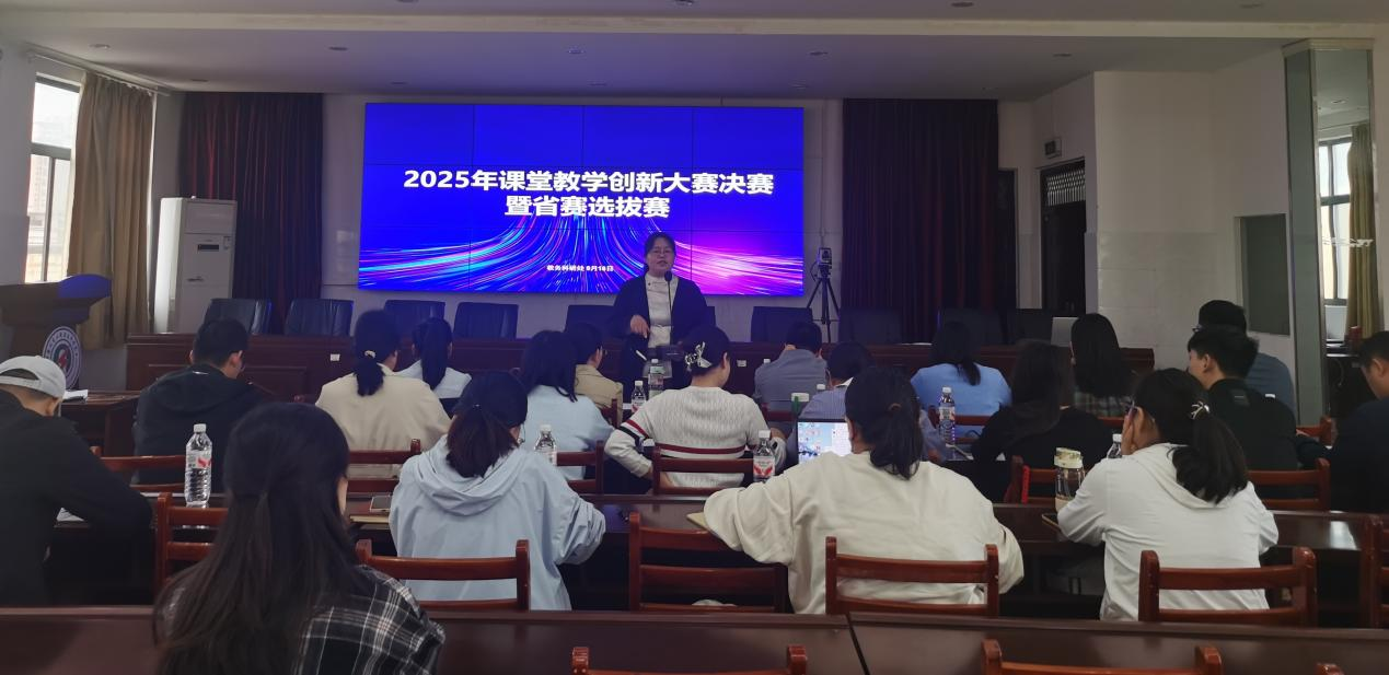 为落实立德树人根本任务,推动日常课堂教学模式创新,激发课堂教学活力,全面提高教育教学质量,全面提升全体教师教学创新能力,太阳成tyc7111cc于9月18日上午八点半在行政楼五楼会议室举办了2025年课堂教学创新大赛现场决赛暨省赛选拔赛。评委组由教务科研处处长侯瑞丽、各教学单位参加省赛并获奖经验丰富的优秀教师组成。比赛期间任课教师到场观摩。