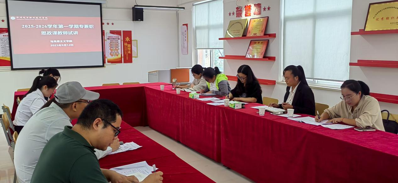 为帮助2025秋季学期新入职教师更快适应教学岗位,提升课堂教学实践能力,确保新学期教学工作高质量开展,9月12日上午,马克思主义学院按照校教务处统一安排,组织开展本学期新聘任教师试讲活动。校教务科研处朱艳平老师到会指导,马院教学副院长王利娟及各教研室主任参与试讲观摩。
