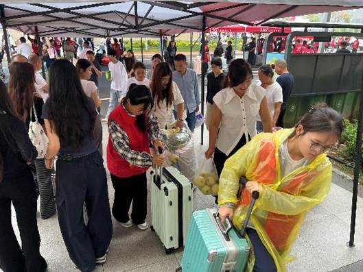 为应对雨天可能带来的不便,学院提前准备了充足的雨具、防水袋等物资,并提前设置好了避雨区。志愿者们细心地为新生和家长披上雨衣,递上纸巾,用贴心的服务化解了雨天的诸多不便。